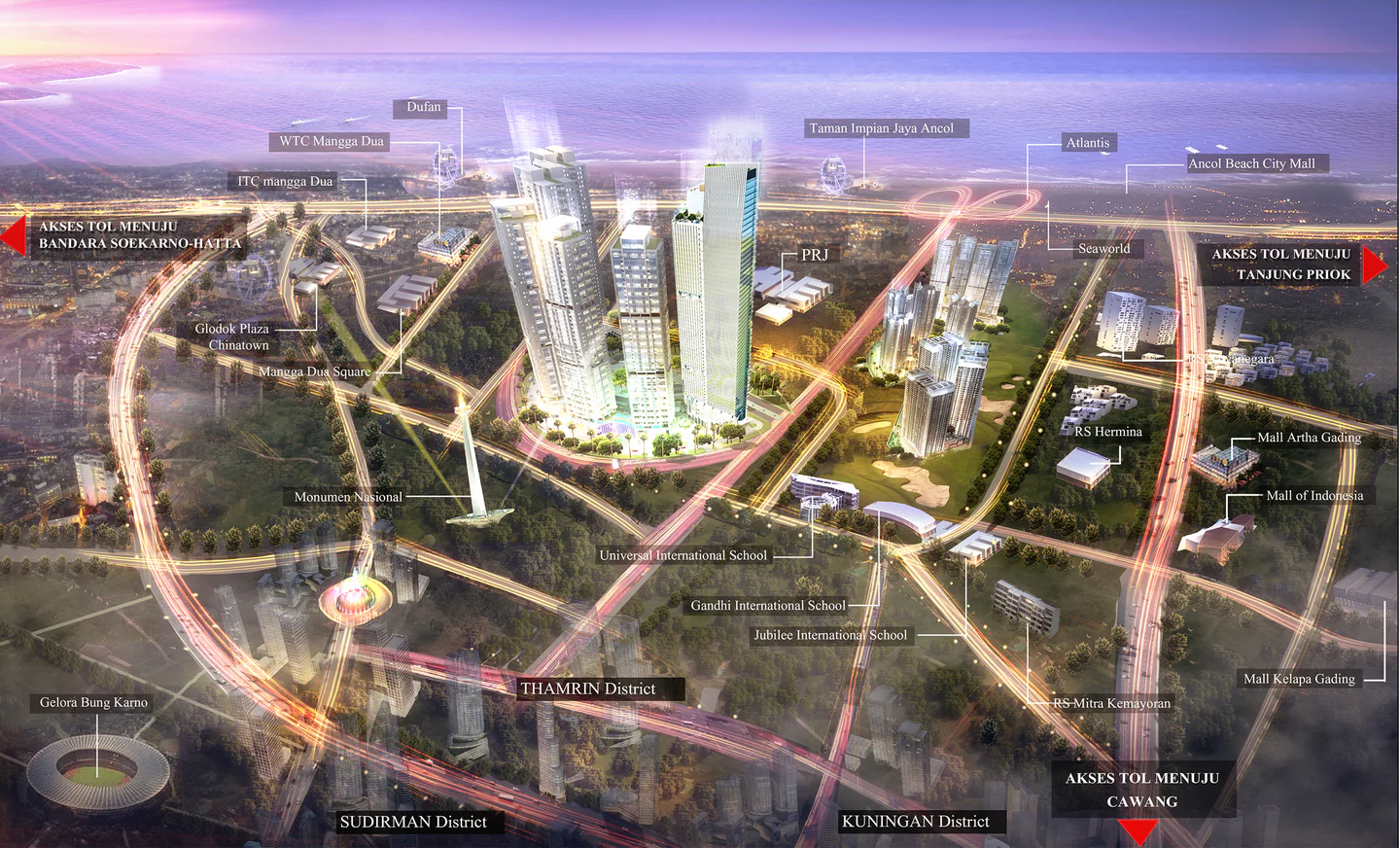 Menara Jakarta, which is located in the front of JIEXPO Kemayoran, has 6 super magnificent towers, 1 Conho (Condo & Hotel), 1 Condo Tower, 1 Office Tower and 3 Suite Towers. The Menara Jakarta is not only an icon in the Kemayoran area but also an icon in Jakarta because the Menara Jakarta will be the tallest tower in the Kemayoran area (280 m2), besides that the Menara Jakarta has a very complete concept (One Stop Living Concept), because apart from Making Suites and Condos to five-star hotel standards, Superblock Menara Jakarta has the only mall in the Kemayoran area, an international scale hotel and office space.